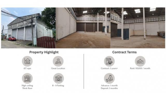 ที่ตั้ง : -โกดัง437ตร.ม.เหมาะสำหรับยิมฟิตเนสโชว์รูมสินค้าร้านอาหารขนาดใหญ่ย่านแจ้งวัฒนะหลักสี่ ใกล้กับ -อยู่ติดกับศูนย์ราชการ มีคนเข้าออกหลายหมื่นต่อวัน - ใกล้รถไฟฟ้า ทางด่วนศรีรัช และโทลล์เวย์ - ใกล้MRT ศูนย์ราชการ (600ม) - ใกล้MRT แจ้งวัฒนะ 14 (500ม)