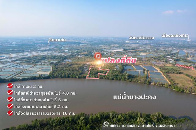 ที่ตั้ง : ขายที่ดินติดแม่น้ำบางปะกง 9 ไร่เศษ (ถมแล้วบางส่วน) ต.ท่าพลับ อ.บ้านโพธิ์ จ.ฉะเชิงเทรา