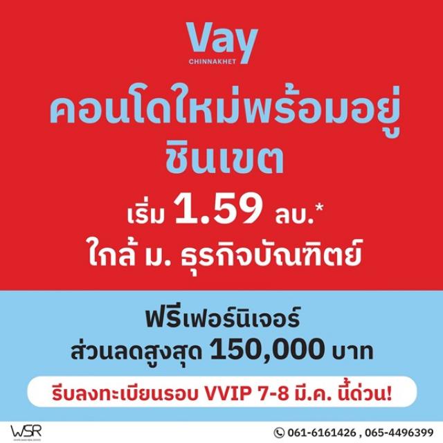 #VayChinnakhet พบกับ “เวย์ ชินเขต” คอนโดใหม่แต่งครบ พร้อมอยู่ เริ่มเพียง 1.59 ล้าน 2 นาที* ถึง ม.ธุรกิจบัณฑิตย์ เปิดชมตึกจริงและจองครั้งแรกพร้อมกัน 7 - 8 มี.ค. นี้ ทักรับส่วนลดสูงสุด 150,000 บาท**
