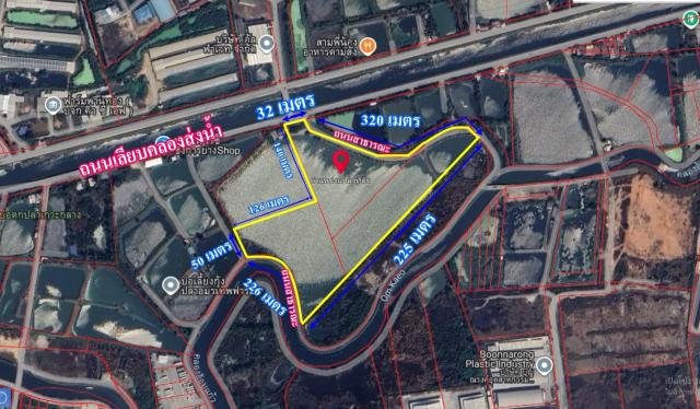 ด้านท้ายแปลงที่ดินติด คลองอ้อมแก้ว คลองนี้มีขนาดใหญ่มาก มีความกว้าง ประมาณ 25 เมตร มีน้ำตลอดทั้งปี ปัจจุบันที่ดินเป็น บ่อเลี้ยงปลา